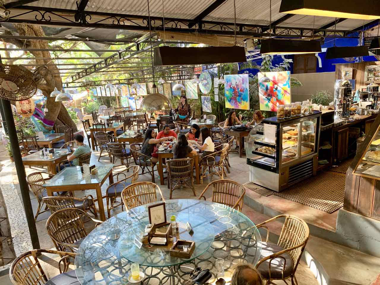 Von der Straße durch eine lange Mauer getrennt, betritt man einen großen, angenehm schattigen Garten mit Bäumen und Pflanzen. Während sich auf der rechten Seite eine Boutique mit Schmuck und stilvollen Kleidern befindet, gibt es linkerhand mehrere Cafétische auf verschiedenen Ebenen. Eingerahmt wird alles durch die Kunstwerke lokaler Künstler. Ein alles überspannendes Netzt verdichtet die relaxte Stimmung.