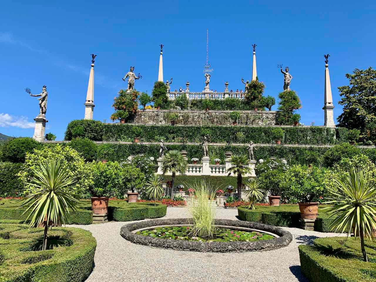 Im Botanischen Garten der Villa Taranto gibt es Terrassengärten mit Statuen, Wasserfällen und einem mit Lotusblumen bedecktem Teich.