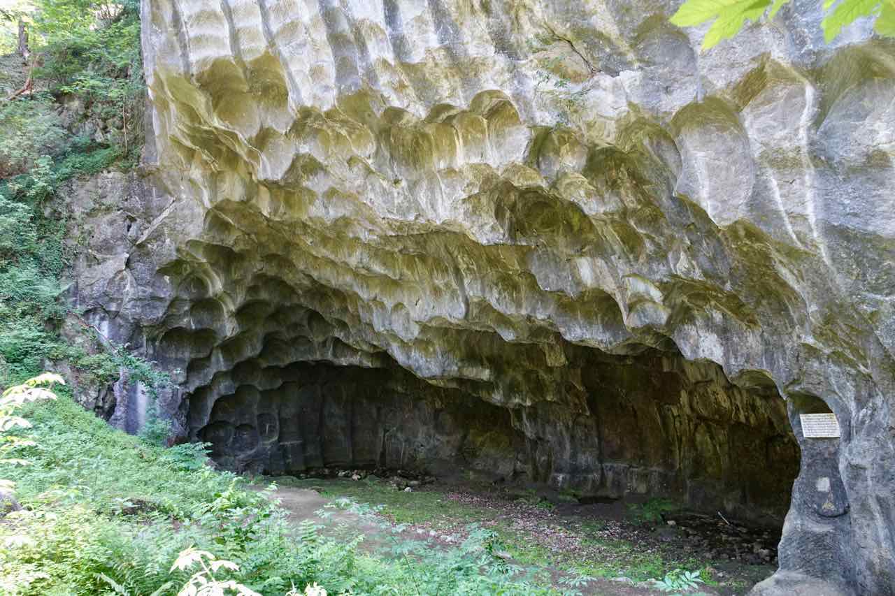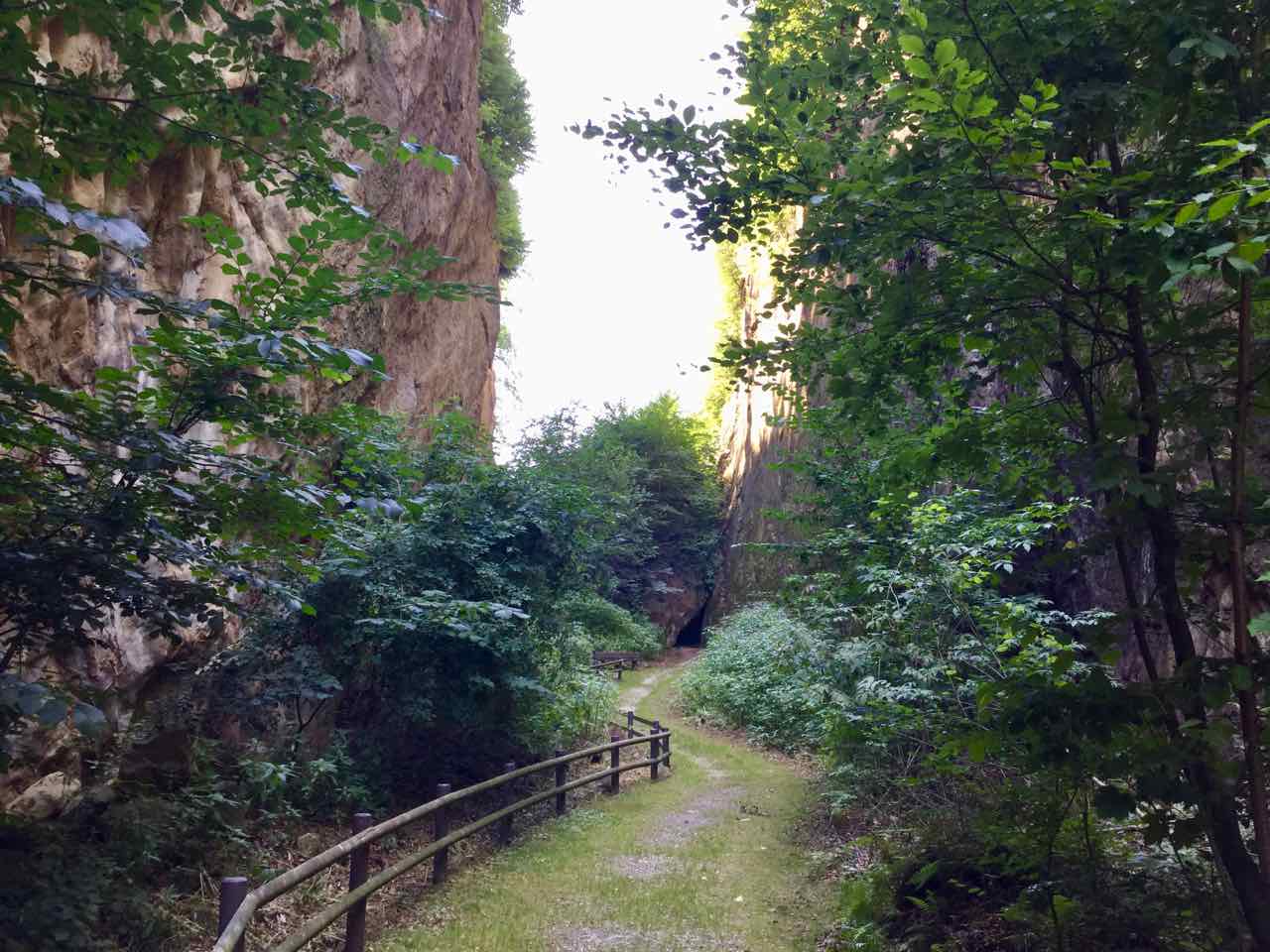 Anschließend gehen wir mit Herrn Tremmel durch die angenehm kühle, 300 Meter lange Wolfsschlucht. Die ist auch Teil des Schiffleutwanderwegs. Die ca 30 Meter hohen Wände des ehemaligen Steinbruchs sind alle aus hartem Sandstein! Noch heute kracht da gerne mal ein Felsbrocken runter.