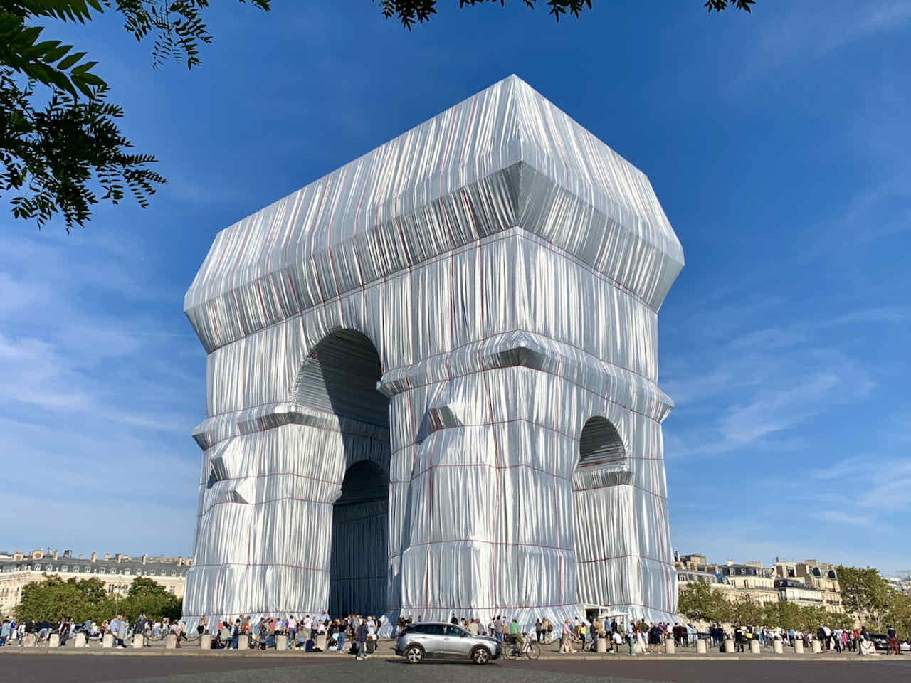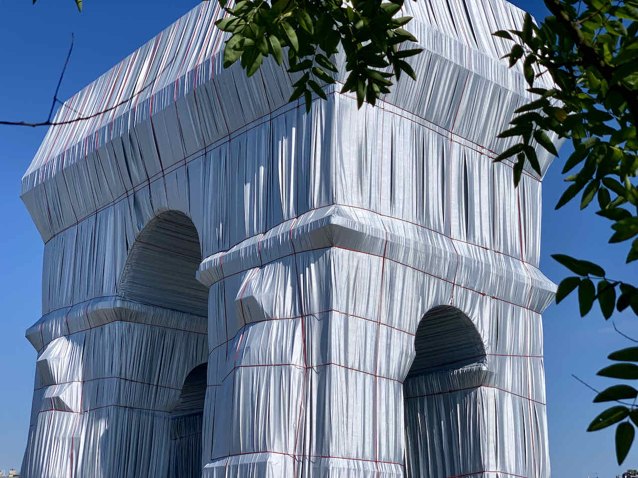 Ich ließ es mir nicht nehmen und habe auch noch die Treppe auf die Dachterrasse des Triumphbogens genommen. Auch hier oben war alles komplett mit der silbrig glänzenden Kunststoffplane bedeckt. Wie auch schon damals im New Yorker Central Park (The Gates), beim verhüllten Berliner Reichstag oder auf den Floating Piers auf dem Iseosee fand ich es auch diesmal wieder ein unvergessliches Erlebnis.