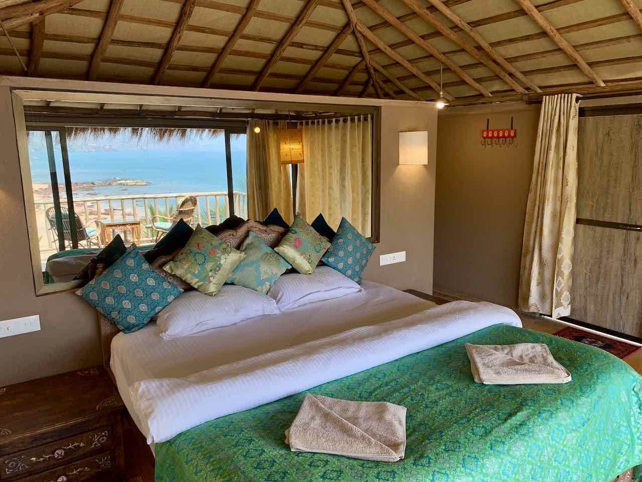Nach ca 300 m kommt man am Ende zu der allein liegenden „Zeltlodge“ Cola Beach Exclusive Tented Resort. Die Zelte haben ein eigenes Bad und etwas Schatten, weil sie locker vertsreut zwischen vereinzelten Bäumen liegen.