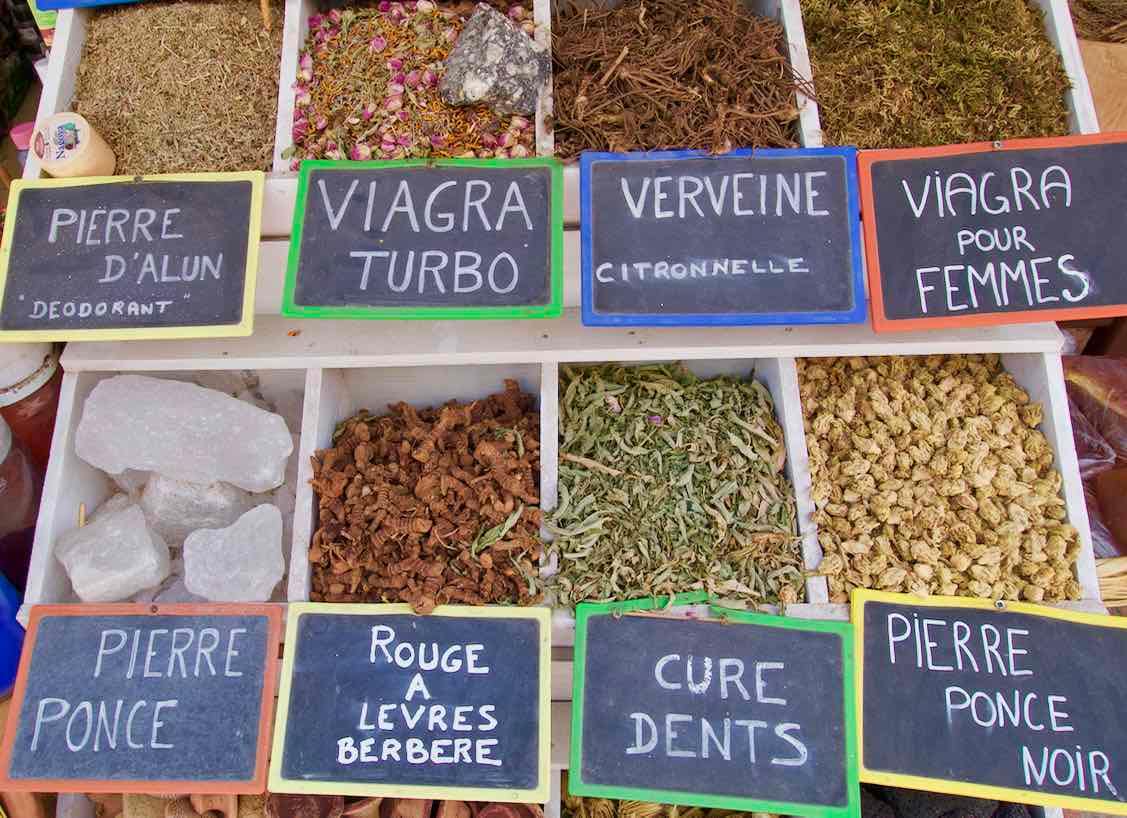 Allmählich wird es wieder belebter. Teppiche hängen von den Wänden und sollen mich zum Kauf animieren. Daneben Souvenirshops, Geschäfte mit Keramik oder Lederwaren. Und dann wieder kleine Läden für die Einheimischen. Ich betrachte die Auslagen. Jede Menge kunstvoll zu Pyramiden aufgeschichtete Gewürze oder Kräuter — immer wieder stoße ich auf „Turbo Viagra“ oder „Viagra pour Femmes“.
