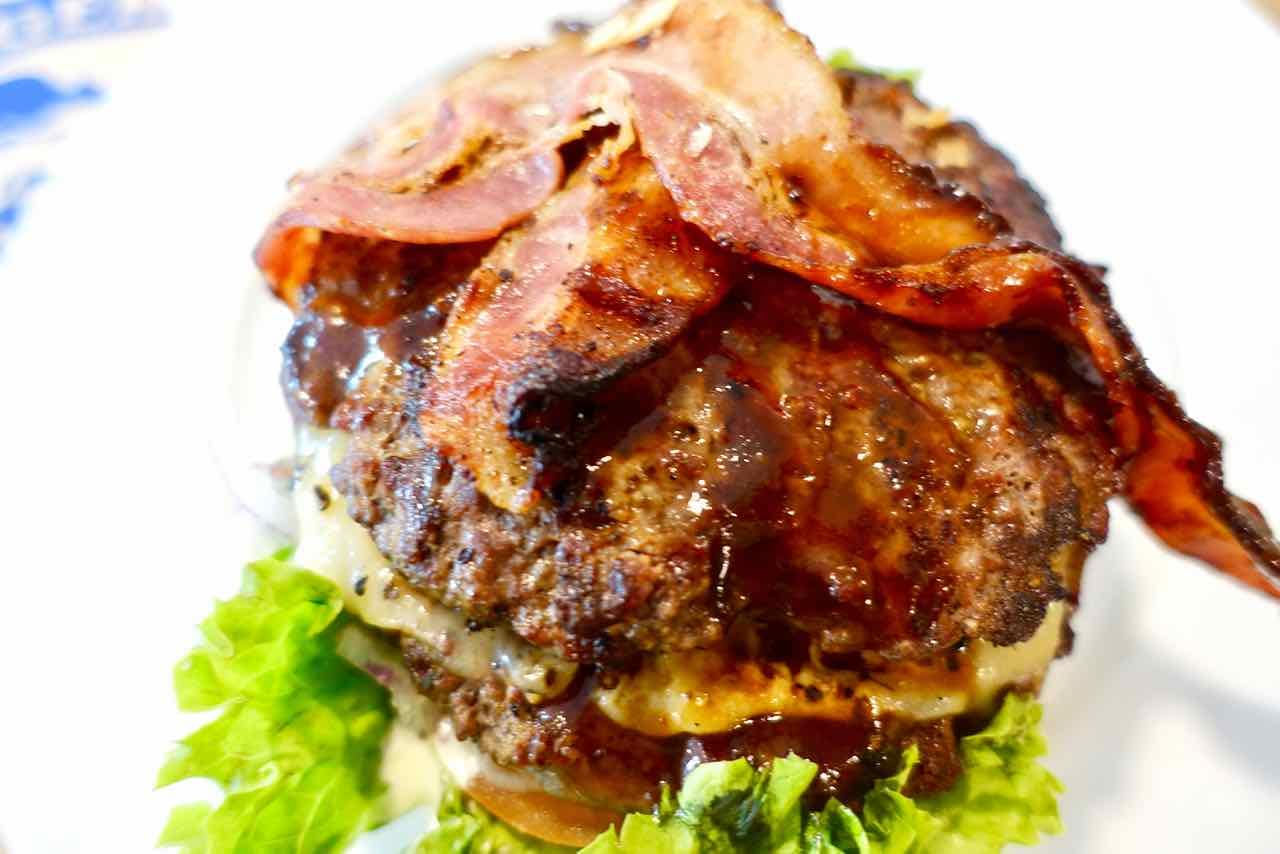 Das Fleisch ist wahnsinnig lecker, gut gewürzt und schön saftig. Mein Favorit ist der Burger mit Double Blue Cheese, knusprigem Speck und passendem Relish.