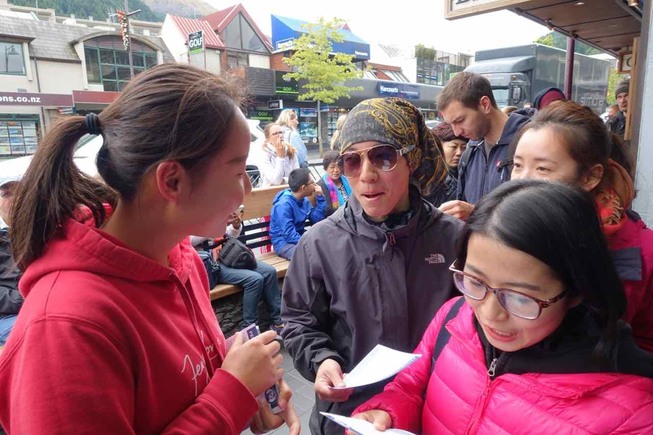 Mädchen in Fergburger-Tshirts gehen die Schlange ab, überreichen uns die Karte und sorgen dafür, dass die Schlange die Eingänge der Geschäfte nicht verstellt. Wie überall in Queenstown sind auch hier jede Menge von Asiaten. Da ist es nur logisch, dass eines der Mädchen eine Chinesin ist.