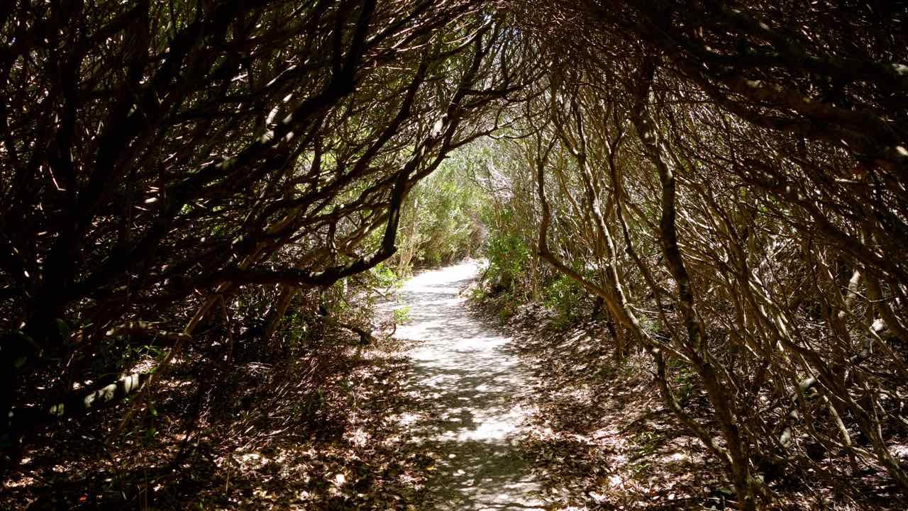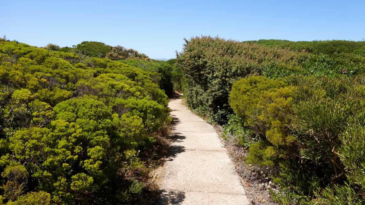 Ich entscheide mich für den linken Teil des Weges, den längeren: Der Planken-Pfad schlängelt sich über 7 malerische Kilometer durch mannshohe Büsche und dann wieder auf den Felsen am Meer entlang. Nur kurz nach dem Anfang muss man ein paar Hundert Meter entlang der Straße gehen, ehe man wieder das Meer unter sich sieht. Immer wieder laden Bänke an Aussichtspunkten zum verweilen ein. Erst auf dem letzten Viertel passiere ich ein paar einsame Strände. In 90 Minuten gelange ich zum Endpunkt, dem Restaurant Dutchies am Grotto Beach.