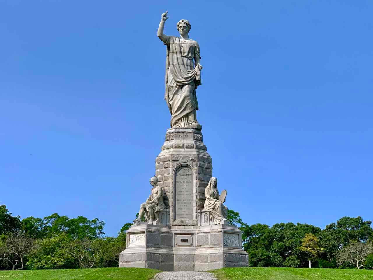 Bevor ich Plymouth Richtung Boston verlasse, statte ich dem in einem Wohnviertel gelegenen National Monument to the Forefathers noch einen Besuch ab. Das bereits 1820 geplante Denkmal wurde erst viel später gebaut und am 1. August 1889 eingeweiht. Mit 27 Metern Höhe die dritthöchste Statue der USA, gilt es als das größte massive Granitdenkmal der Welt. Früher als Pilgerdenkmal bekannt, soll das auf einem grünen Hügel liegende Denkmal an die Auswanderer der Mayflower erinnern.