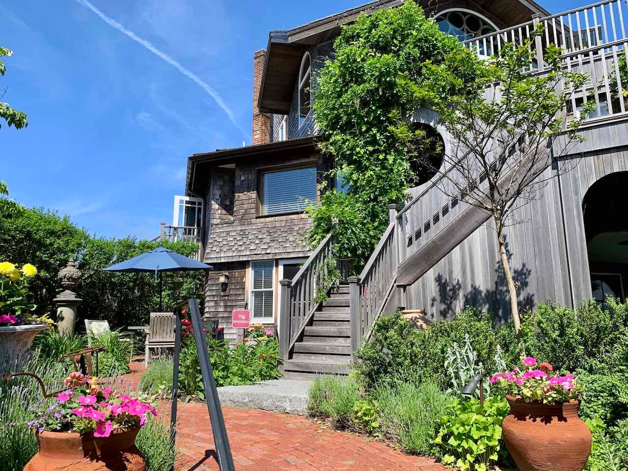 Umgeben von einem wunderschönen Garten hat man freien Blick Richtung Provincetown und Meer. Es ist nicht eines der üblichen, modernen Hotels. Es mag etwas überladen sein, aber man fühlt sich in ein anderes Zeitalter versetzt. Dabei muss man auf modernen Komfort nicht verzichten. Und als Besonderheit gibt es da auch noch das tägliche (kostenfreie) Winetasting am späten Nachmittag: verschiedene Weine und jede Menge Leckereien.