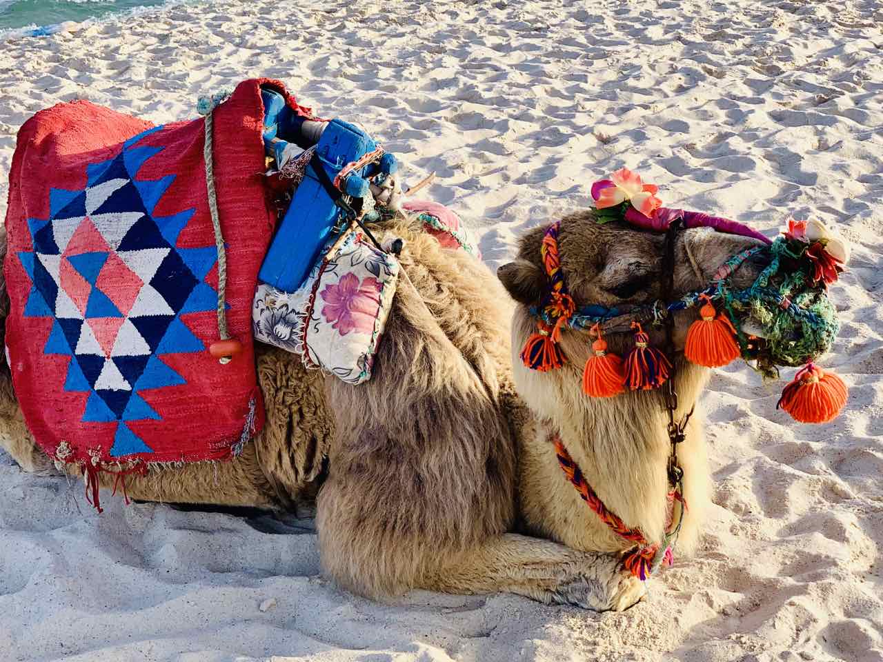 Der Badeort Hammamet liegt 65 km südlich von Tunis, an der Südspitze des Cap Bon. Die Stadt ist vom Tourismus bestens erschlossen. Das bedeutet, dass es viele Hotelanlagen gibt, von Mittelklasse bis 5‑Sterne-Hotels. Fast alle haben einen großen Pool. Manche sogar mehrere. Dabei hat das ca. 4 Kilometer von Hammamet entfernt liegende Gebiet in dem sich die Hotels befinden einen fabelhaften breiten und unendlich weiten Sandstrand. Aber der Tourist von heute braucht anscheinend beides. Das landesübliche Kamel liegt faul am Strand, wenn nicht gerade Kinder auf ihm reiten. Sein Besitzer versichert mir, dass es Detlev heißt! Ich frage mich, welchen Namen es wohl hat, wenn er mich für einen der vielen Russen hält.