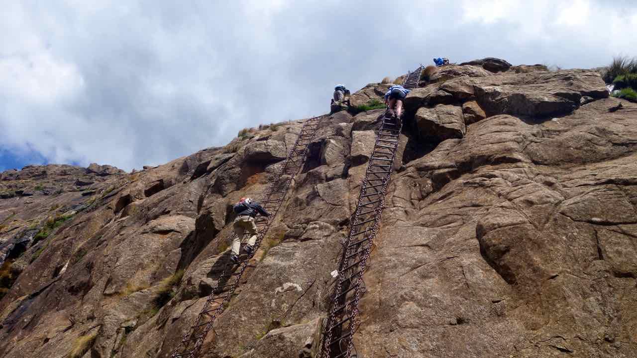 Erst später wird es wieder spannend. Nach einer Hochebene kommen wir zu zwei steilen Passagen mit Strickleitern – naja, Strickleiter ist etwas irreführend, da die Leitern aus Stahlseilen sind.