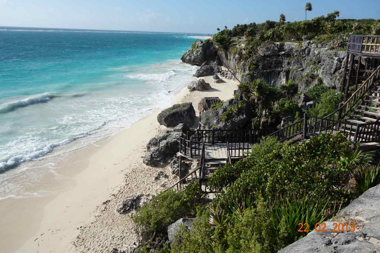 Nach 3 Nächten gings zurück zum Festland und weiter in den Süden zur Maya-Stätte Tulum. Hier ist der endlos lange Strand wunderschön und entsprechend reiht sich eine Hotel-Anlage an die andere. Ich war aber die erste Nacht im Pueblo, sprich in der Stadt untergekommen. Hier geht die Fernstraße mittendurch und es hat somit den Charme einer Autobahnraststätte mit jeder Menge Kneipen und Unterkünften rechts und links der Hauptstraße. Bis zum eigentlichen, kilometerlangen Strand kostet es mit dem Taxi gut 6 US$. Ich versuchte dann auch am nächsten Tag ein Hotel direkt am Strand zu bekommen. Allerdings war fast alles ausgebucht oder die Preise lagen bei über 200 US$. Für 150 in der dritten Reihe und dann max. für eine Nacht wollte ich nichts nehmen. Das CoquiCoqui für 270 Dollar hat mich allerdings schon gereizt 🙂